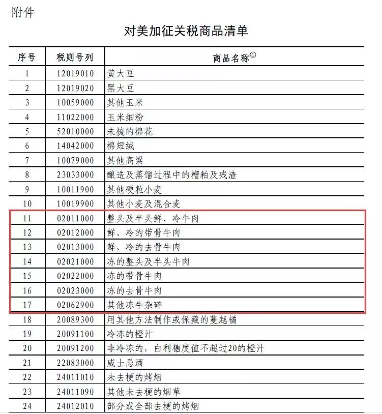 當(dāng)天,根據(jù)《中華人民共和國(guó)對(duì)外貿(mào)易法》和中華人民共和國(guó)進(jìn)出口條例相關(guān)規(guī)定,及經(jīng)國(guó)務(wù)院批準(zhǔn),國(guó)務(wù)院關(guān)稅稅則委員會(huì)決定,對(duì)原產(chǎn)于美國(guó)的大豆、汽車(chē)和牛肉等14類(lèi)106項(xiàng)商品加征25%關(guān)稅。