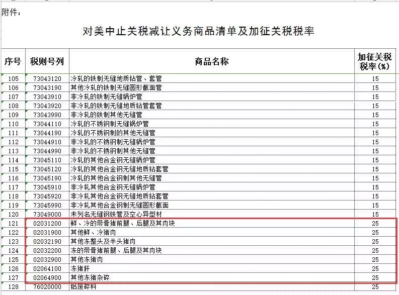 作為回應(yīng),經(jīng)中國(guó)國(guó)務(wù)院批準(zhǔn),國(guó)務(wù)院關(guān)稅稅則委員會(huì)決定自2018年4月2日起,對(duì)原產(chǎn)于美國(guó)的7類(lèi)128項(xiàng)進(jìn)口商品中止關(guān)稅減讓義務(wù),在現(xiàn)行的適用關(guān)稅稅率基礎(chǔ)上加征關(guān)稅,其中美國(guó)豬肉各類(lèi)產(chǎn)品赫然在列。