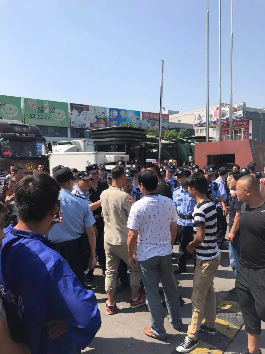 2018年9月5日7點(diǎn)30分左右,杭州五豐聯(lián)合肉類冷藏有限公司、杭州冷凍食品交易市場(chǎng)發(fā)生嚴(yán)重“堵門”事件,市場(chǎng)北門、西門、東門被圍得水泄不通,現(xiàn)場(chǎng)聚集了多位市場(chǎng)商戶和多輛三輪車。