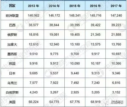 2013-2017年全球豬肉銷量分國家統(tǒng)計表(千噸)