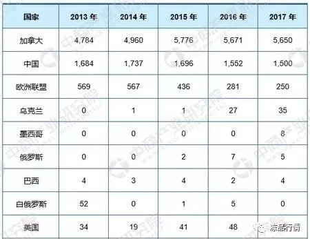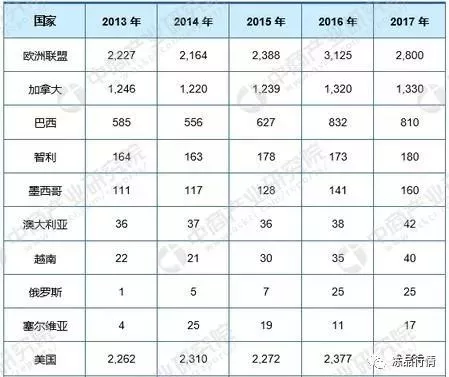 2013-2017年全球豬肉出口量分國家統(tǒng)計表(千噸)
