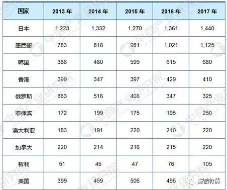 2013-2017年全球豬肉進口量分國家統(tǒng)計表(千噸)