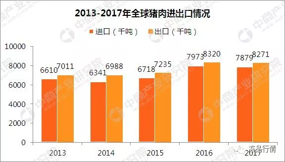 根據(jù)數(shù)據(jù)統(tǒng)計,2017年全球豬肉進口量為787.9萬噸,比2016年稍微下滑。出口量為827.1萬噸。