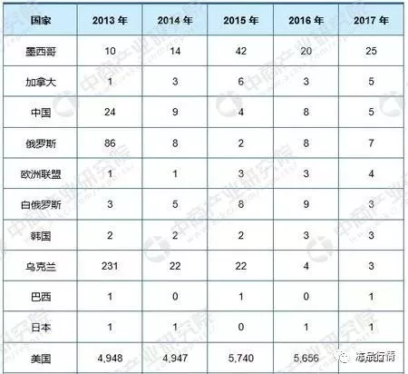 2013-2017年全球生豬出口量分國家統(tǒng)計(千頭)